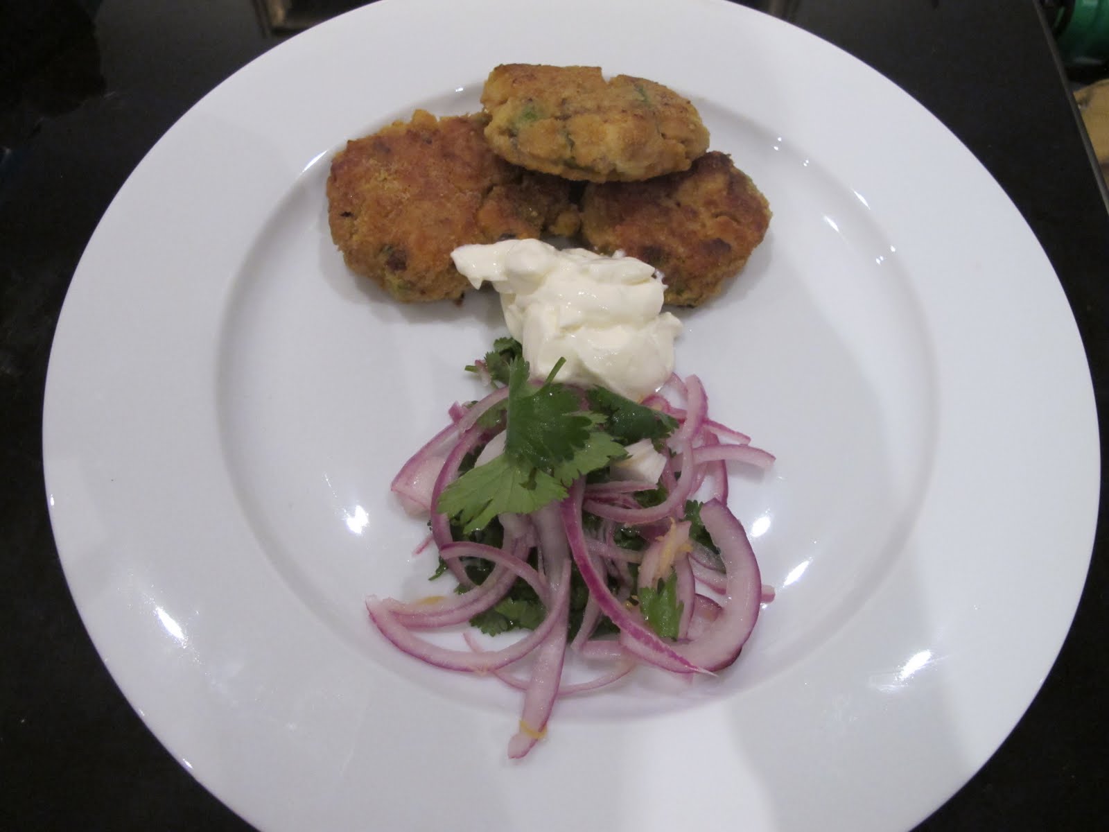 Chickpean, Chilli and Coriander Patties with Marinated Red Onion Salad.